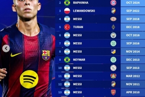 据统计,巴萨球员在欧冠历史上共计16次上演帽子戏法,具体如下: