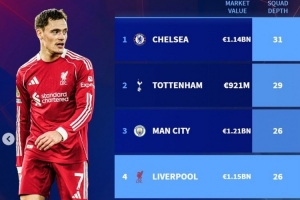 全文摘要:利物浦联赛杯大轮换0-3惨败,主帅斯洛特抱怨人手不足。《转会市场》随即统计英超BIG6阵容深度:阿森纳总身价最高(13.1亿),切尔西(11.4亿)与利物浦(11.5亿)紧随其后;曼城阵容最精简(26人),切尔西人数最多(31人),曼联总身价最低(7.30亿)。