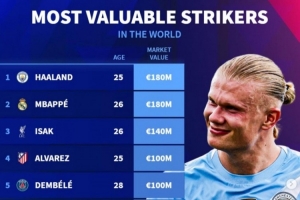 全文摘要:根据德国转会市场最新数据,哈兰德与姆巴佩以1.8亿欧身价并列中锋榜首。伊萨克以1.4亿欧位列第三,阿尔瓦雷斯、登贝莱则以1亿欧并列第四。该榜单反映了当前足坛顶级中锋的市场价值。
