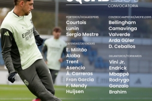 全文摘要:皇马公布西甲客场战巴列卡诺大名单,琼阿梅尼缺席。门将为库尔图瓦等三人;后防线米利唐、阿拉巴等在列;中场由贝林厄姆、卡马文加领衔;前锋则包含维尼修斯、姆巴佩等攻击手。