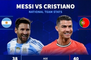 德转数据显示国家队对比:梅西196场115球64助攻,C罗226场143球46助攻。