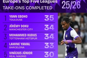 五大联赛成功过人榜:多库、库杜斯均第二 亚马尔、维尼修斯在列