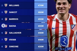 全文摘要:德转更新西甲球员身价,非皇马巴萨球员中,阿尔瓦雷斯以1亿欧身价高居榜首。威廉姆斯(7000万)和桑切特(6000万)分列二、三位。前十名中,马竞和毕尔巴鄂竞技各占四席,成为最大赢家。